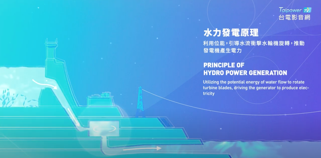 位於高處的水具有位能,當它往低處流動的時候,位能會轉換成動能。水力發電就是利用高處的水往低處流動時所產生的動能,來推動水輪機,帶動發電機發電。