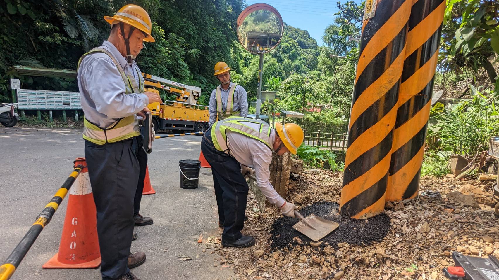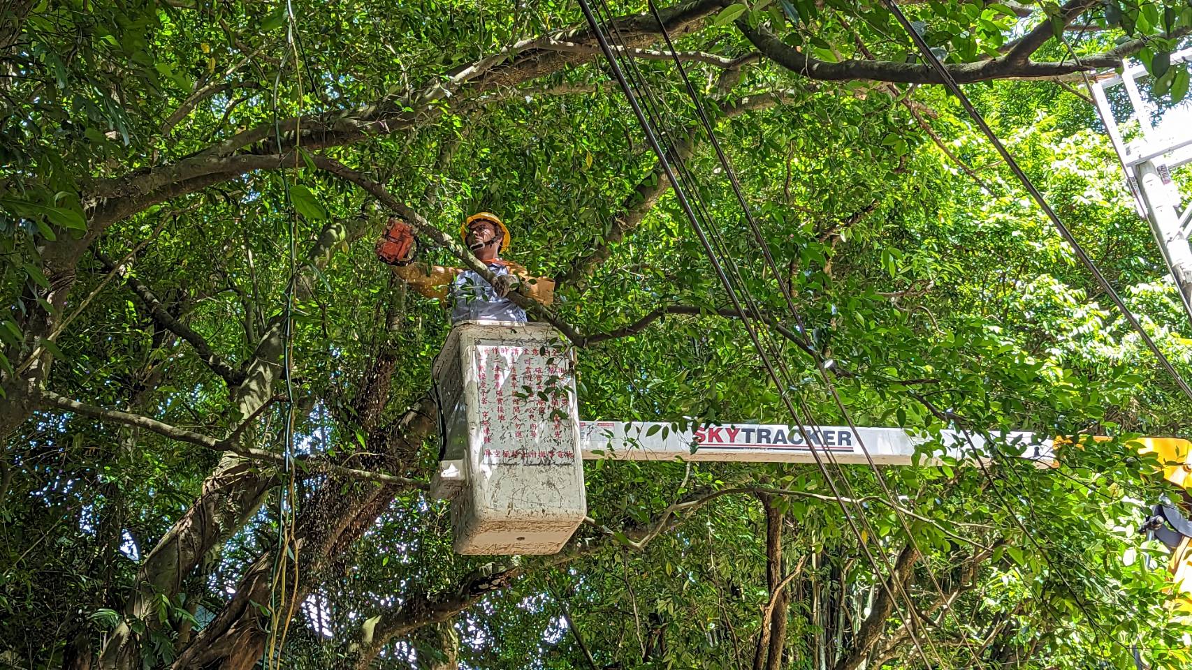 台電人員修剪樹木,避免颱風帶來的強風豪雨造成樹木傾倒壓損電桿及電線。