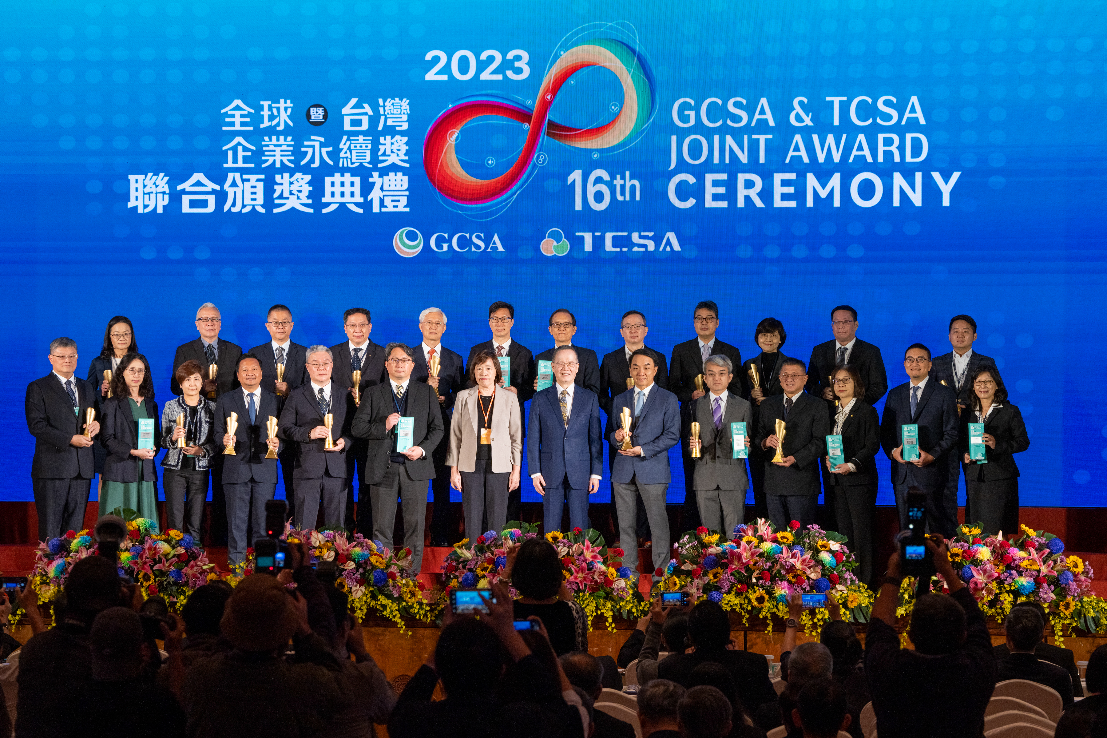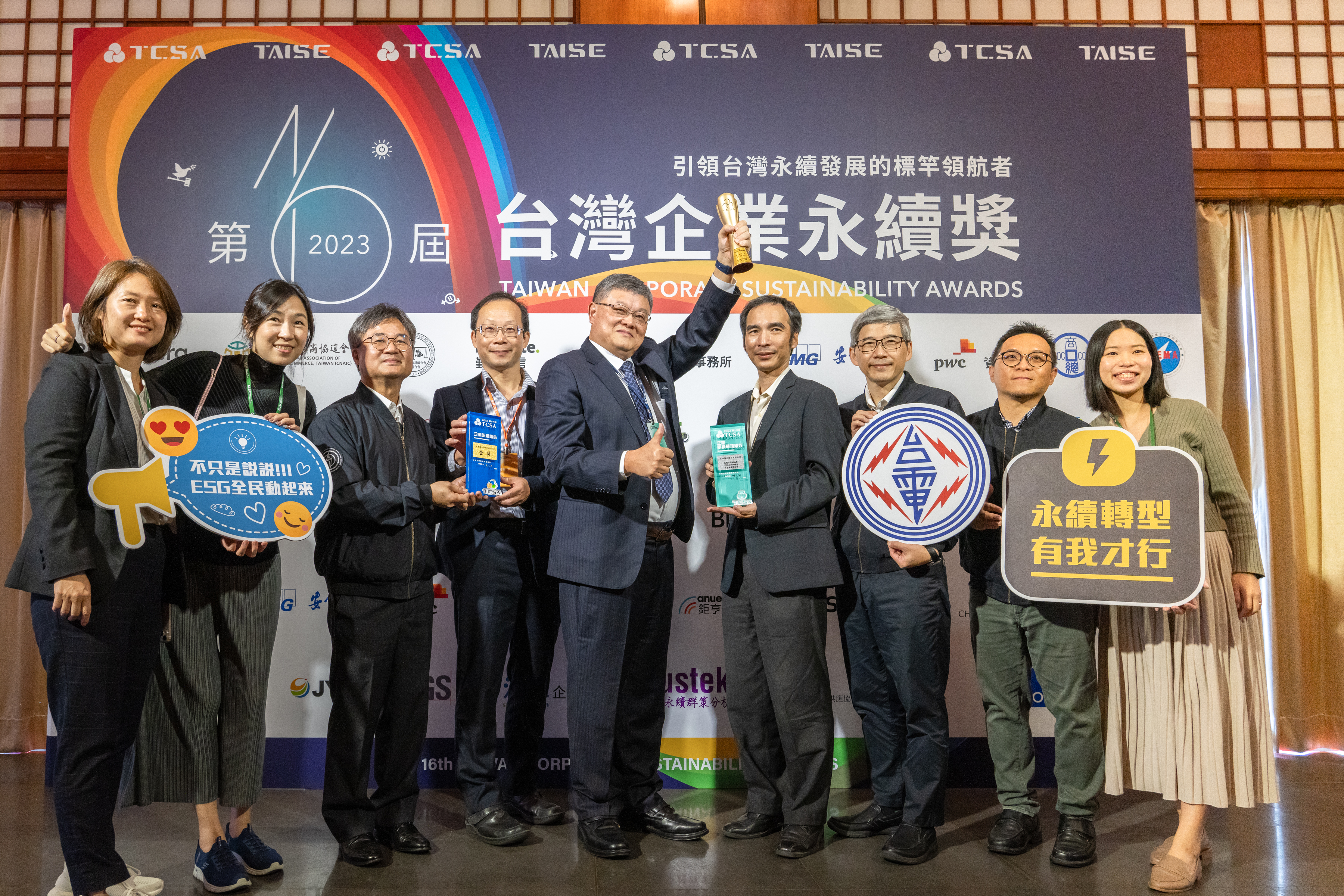- 台電奪下台灣企業永續報告金獎、台灣百大永續典範企業獎及創意溝通領袖獎、資訊安全領袖獎及性別平等領袖獎等5項大獎,台電副總經理吳進忠(中)率台電團隊一同接受肯定。