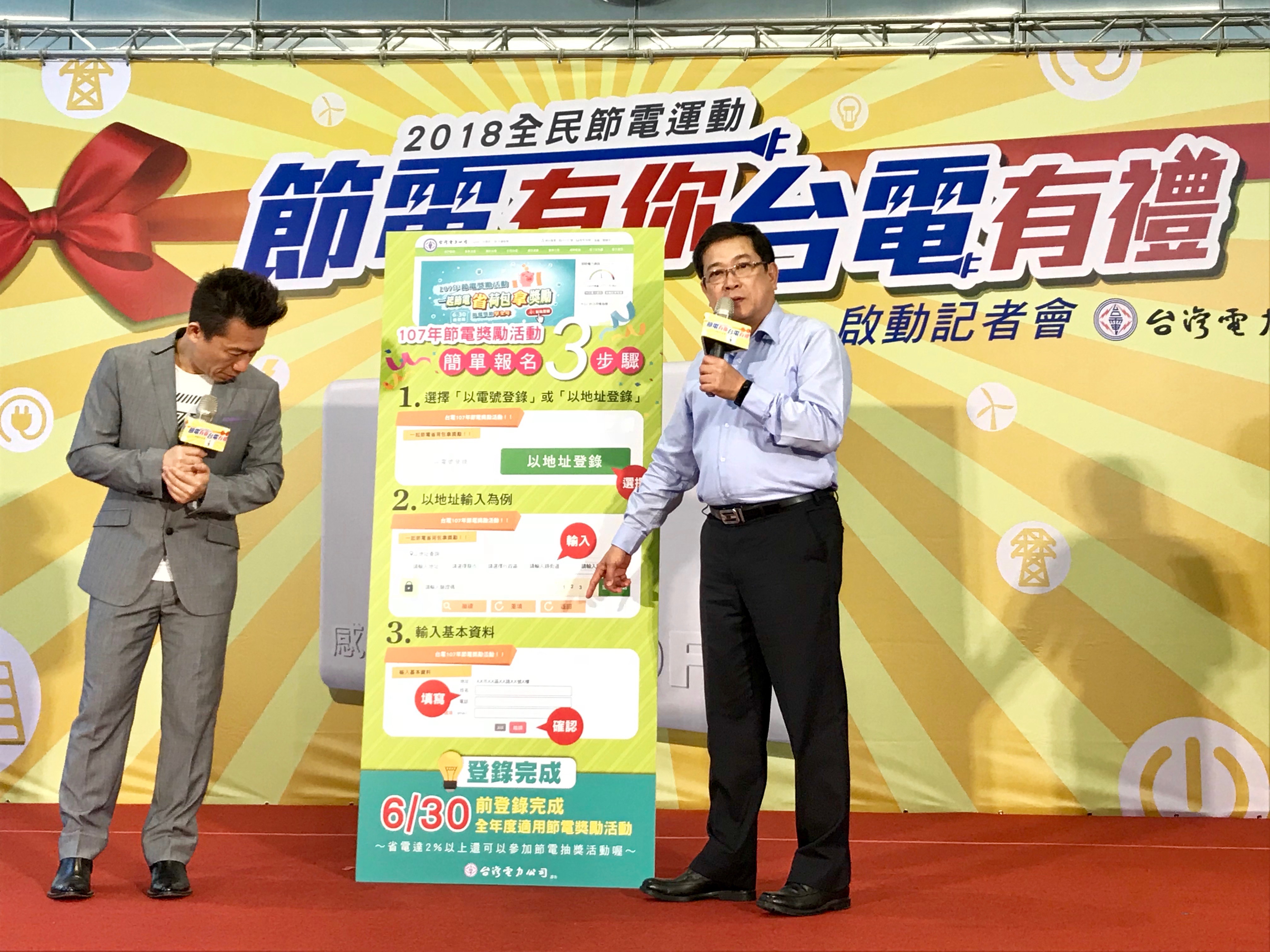 - 台電今舉辦2018節電有你台電有禮記者會,由年度活動大使郭子乾(左四)與台電董事長楊偉甫(右四)等貴賓,共同宣示活動起跑,鼓勵民眾參與節電拿2600萬獎金。