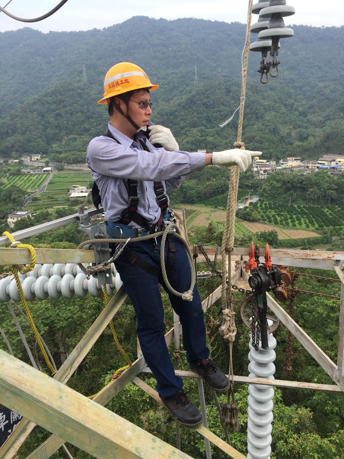 現任職於台電輸變電工程處北區施工處的汪信宏,是104年考取台電新進僱員「輸電線路維護」的生力軍,主要負責輸電鐵塔的架空線路工作,平時要在50至60公尺高的鐵塔上作業。