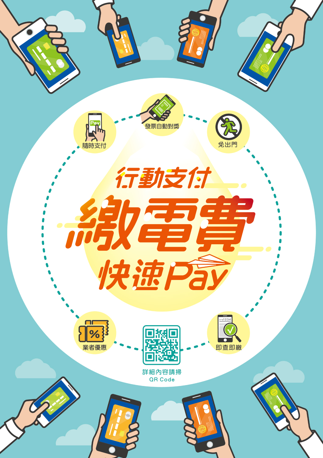 你家電費怎麼繳?目前全台有約5成民眾(約700萬戶)透過銀行約定固定扣繳電費,約4成(約580萬戶)用戶習慣利用超商銀行臨櫃等代收繳費。台電表示,為提供多元繳費管道,除了去(106)年9月開放線上信用卡繳電費,今(107)年7月起更首度結合歐付寶、Pi拍錢包、街口支付、一卡通等8大行動支付業者,讓民眾只要掃一下帳單上新增的QR Code,隨時隨地都可輕鬆繳費,還可自動發票對獎,或透過行動支付APP綁定家中電號,可即時查詢未繳電費,每期電費也會自動推播、通知提醒。