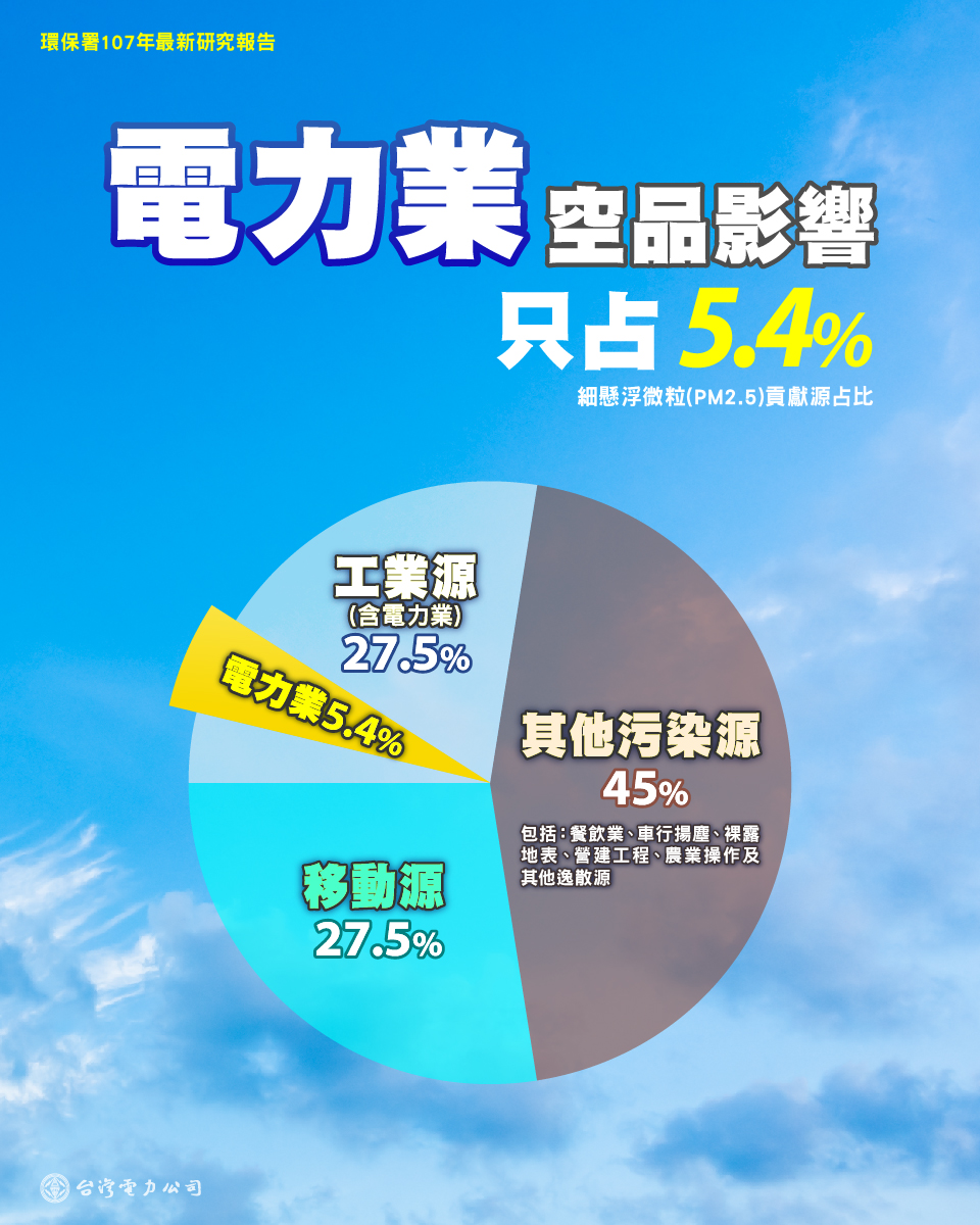 然而台電也疾呼,空污來源眾多,電力業並非唯一污染源。雖然電業的影響占比依據環保署最新的調查研究結果,只有5.4%,但電力業還是努力做好減排,台電公司在環保署106年所推動的空污防制策略與行動計畫中,推動6大電廠8大改善計畫,成績亮眼,空污排放量連年下降,而107年相較於106年,電力及燃氣供應業者整體空污減排量更是佔了全國減排量的64%,減量成效居全國首位。為友善環境,台電主動貢獻心力改善排放,並已取得成果,但仍希望社會各界以全面治理觀點處理空污議題,以免影響處理空污的時機。
