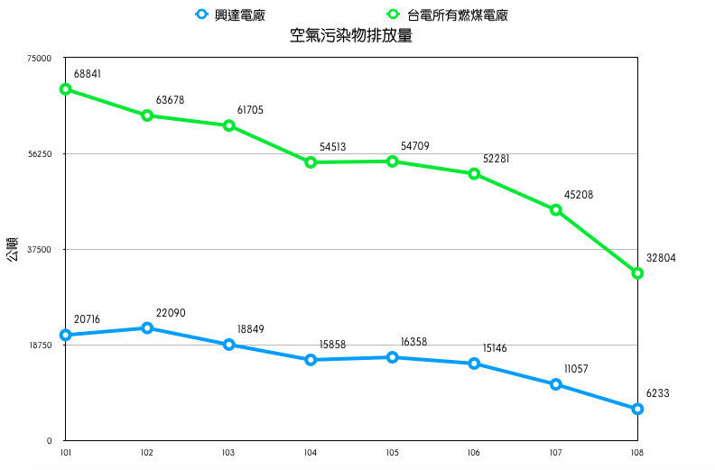 此外台電表示,台電針對燃煤電廠持續從事防治設備改善,以興達電廠為例,自民國80年起至今已投入309億元改善空污排放,今(108)年空污排放量和88年相比,空氣污染物合計削減85%,相較去(107)年減少超過4成,排放改善相當顯著。如以台電所有燃煤電廠來看,今年排放量預計也將較105年減少達4成。