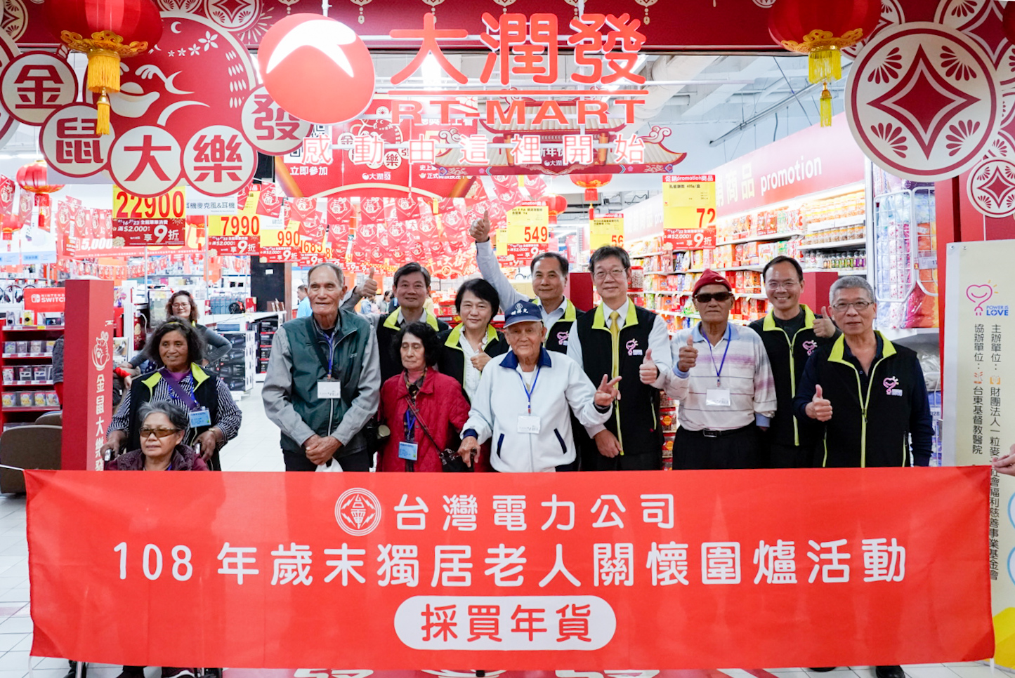 - 圍爐過後,台電公服處處長李忠正(右4)率台東區處志工陪同長輩開心前往賣場選購年貨
