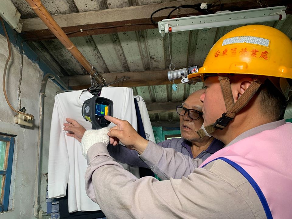 除了暖呼呼的圍爐,台電台東區處也安排外線技術員到府為長輩進行屋內線路檢測,更換不良線路設備,為長輩居家用電安全把關。今年87歲的羅奶奶長期臥床,台電志工見住家燈光昏暗,馬上幫羅奶奶換上新燈管,再利用紅外線熱影像檢測儀偵測出家中老舊不良插座並協助修繕,讓羅奶奶一家能住得更安心。