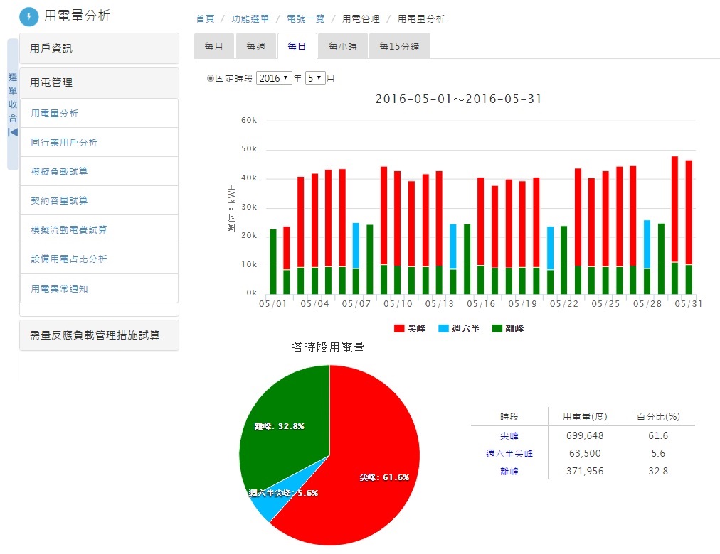 台電說明,高壓用戶服務平台整合用戶完整用電數據,讓台北捷運、台鐵等大用戶也可用一個帳號縱覽其全台所有電號用電情況,如5年內用電量、電費等用電紀錄,或是以月、週、日、小時與每15分鐘為單位的「用電量分析」,並結合資訊化圖表呈現,讓用戶可輕易了解自身用電情況與特性,如同為每個用戶打造客製化的專屬「電能管理系統」,協助用戶可隨時調節最符合成本與效率的用電模式,同時也提供讓用戶評估參與各種用電管理措施的「試算」功能,如用戶可「一鍵」看出自己是否適合參加需量競價措施,或是可藉「模擬負載試算」協助建議契約容量調整,以及「用電異常通知」等功能,更有可讓用戶「與同業PK」用電管理的同行業用戶分析比較,例如台鐵可以用此功能跟同為陸上運輸業的高鐵、北捷等同業相比「1度電用多少錢」的平均用電單價,且比較的資料會採用隸屬同行業、但去除個資識別化資訊的平均數據,不用擔心個資問題。