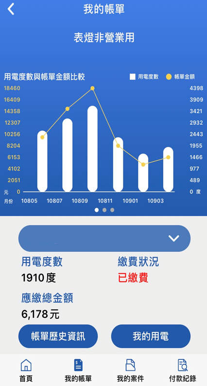 圖說供參:「台灣電力APP」推出用電管理功能,民眾除可查詢與繳付最新一期帳單,若為用電戶名本人,完成電號認證即可進一步查詢歷史帳單與用電圖表,比較用電差異,瞭解自身的用電狀況。