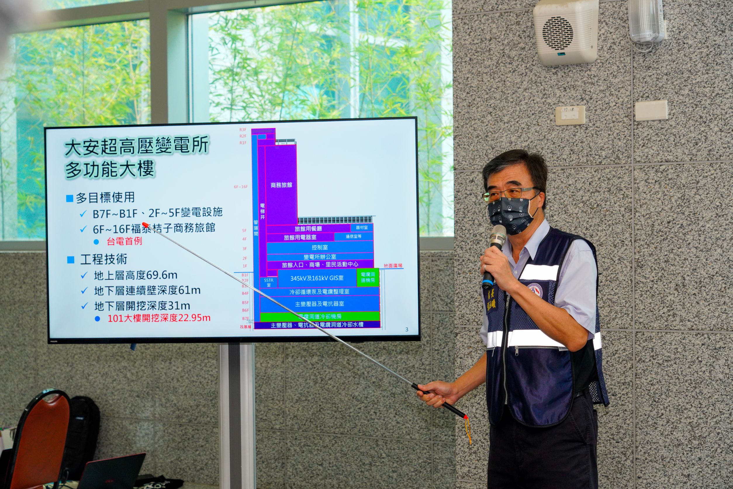 - 大安變電所從開挖深度、推進速度、急曲彎度,三大面向比較,施工難度不輸捷運。圖為台電北區施工處處長張涵曦說明大安變電所整體結構規劃。