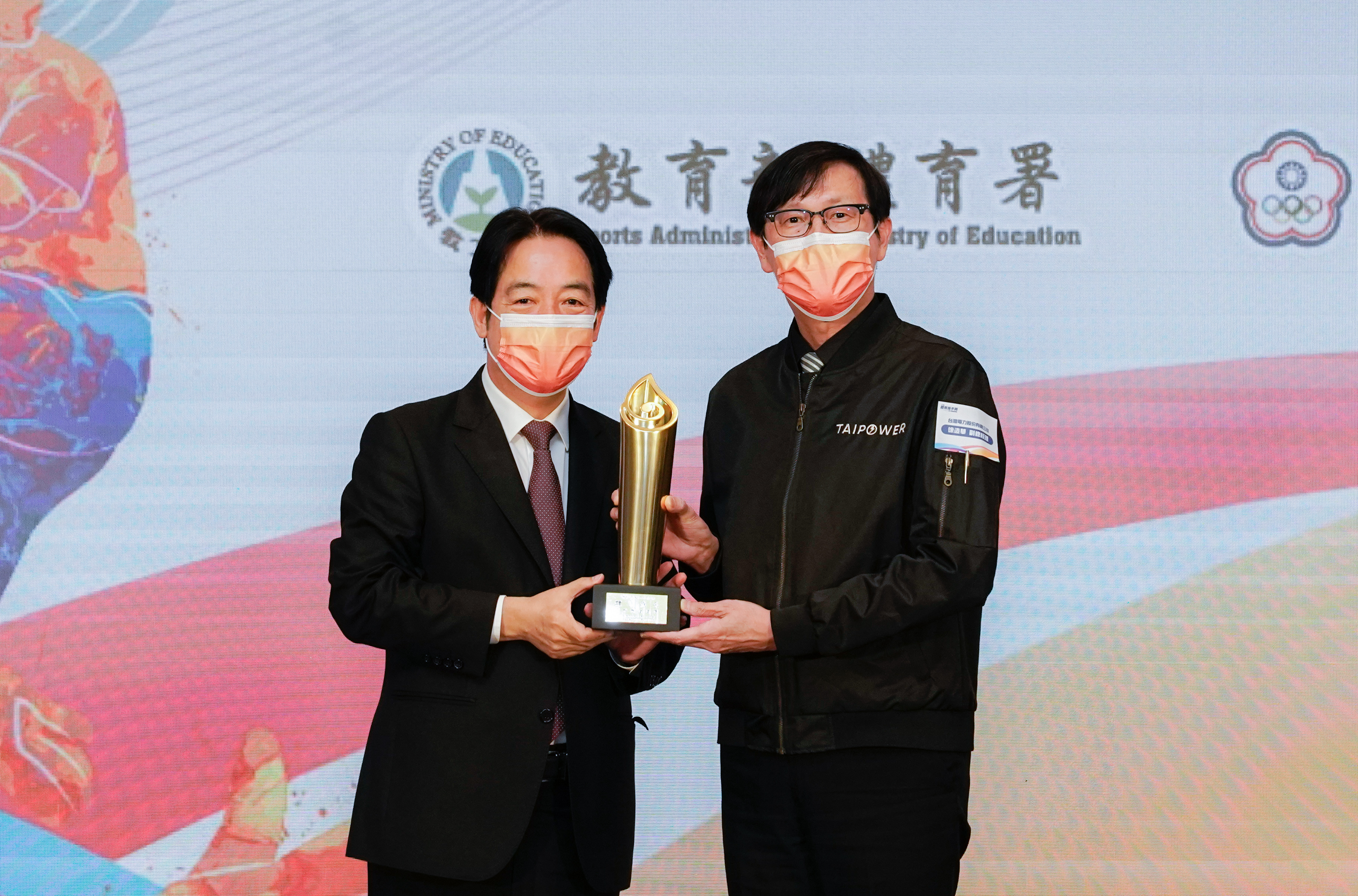 - 台電投入臺灣體育發展長達76年,今(10)日第13次榮獲體育推手獎,現場由台電副總徐造華(右)接受副總統賴清德(左)頒獎表揚。