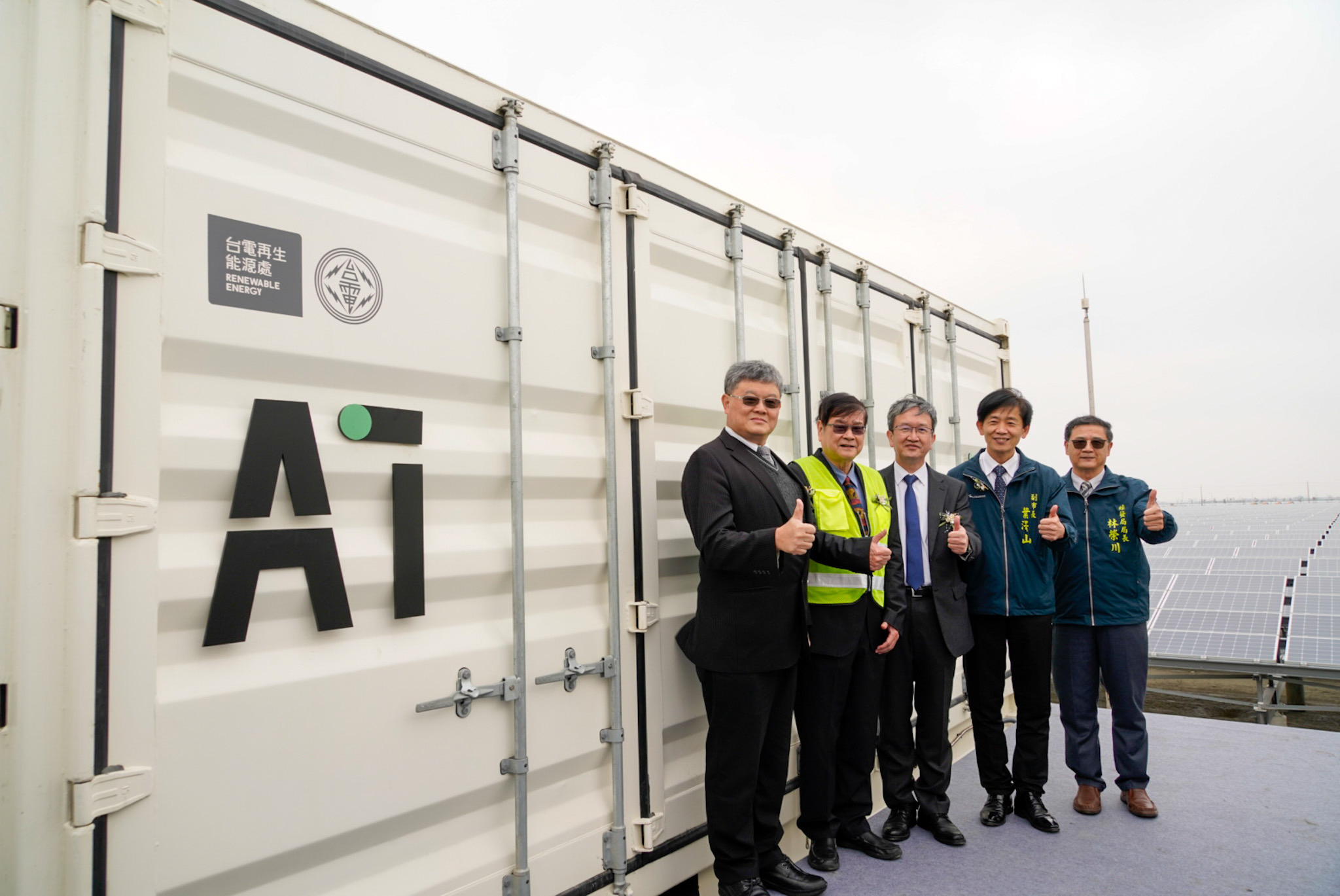 - 台電今日上午舉行「光儲合一 續電給力」台南鹽田光電儲能系統啟用典禮,台電總經理王耀庭(左4)、台南市副市長葉澤山(右4)與聯合再生能源執行長潘文輝(左3)等貴賓共同見證全台最大儲能系統正式啟用。