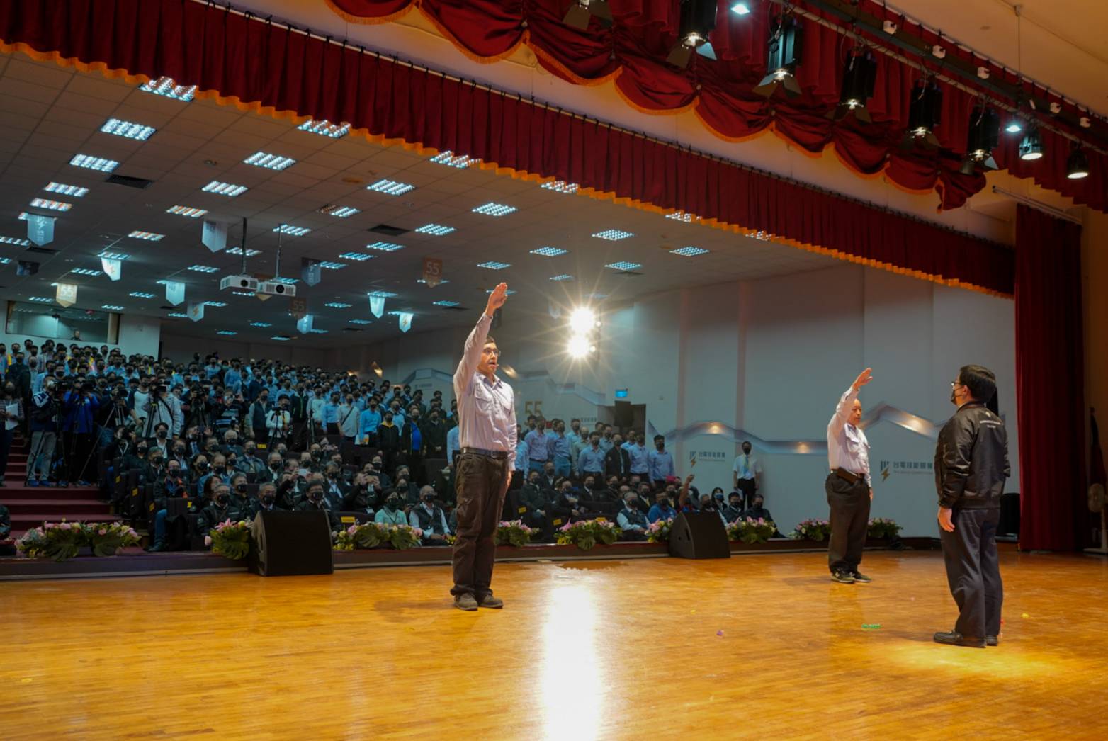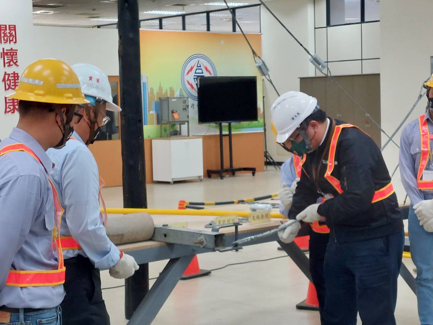 除了新科技運用,台電今年度技能競賽一樣不忘基本功的傳承重要性,現場安排平時用以穩固電桿基座的「配電線路支線製作」體驗,由台電代理董事長曾文生與台電工會楊振雄副理事長全副武裝體驗第一線人員維修工作。