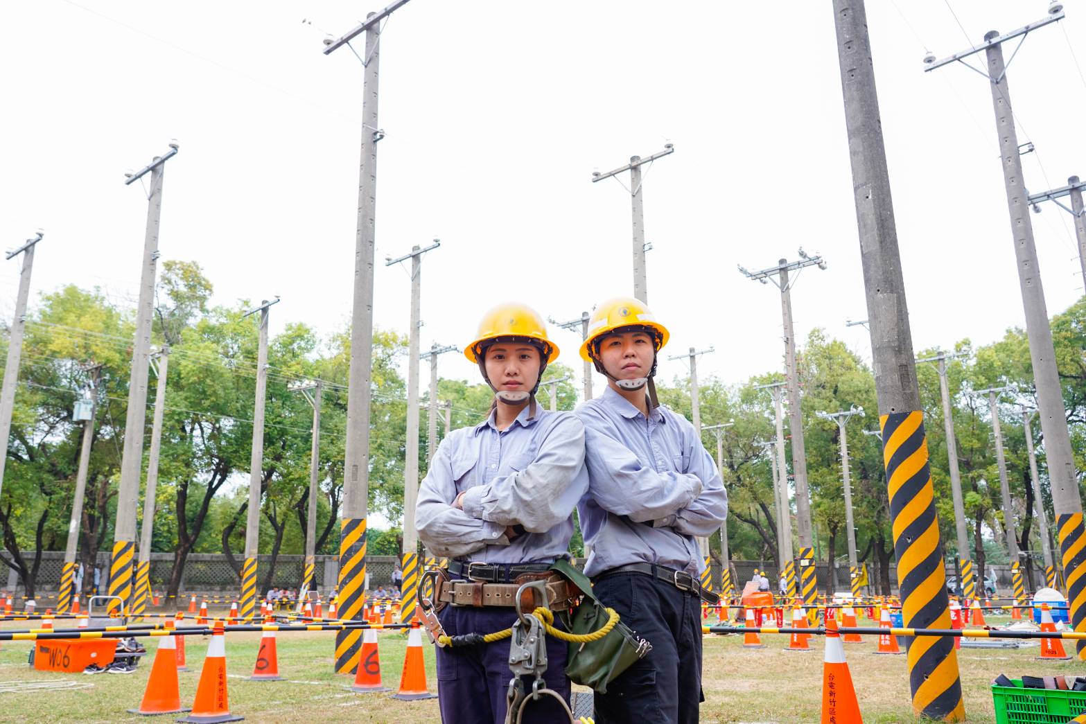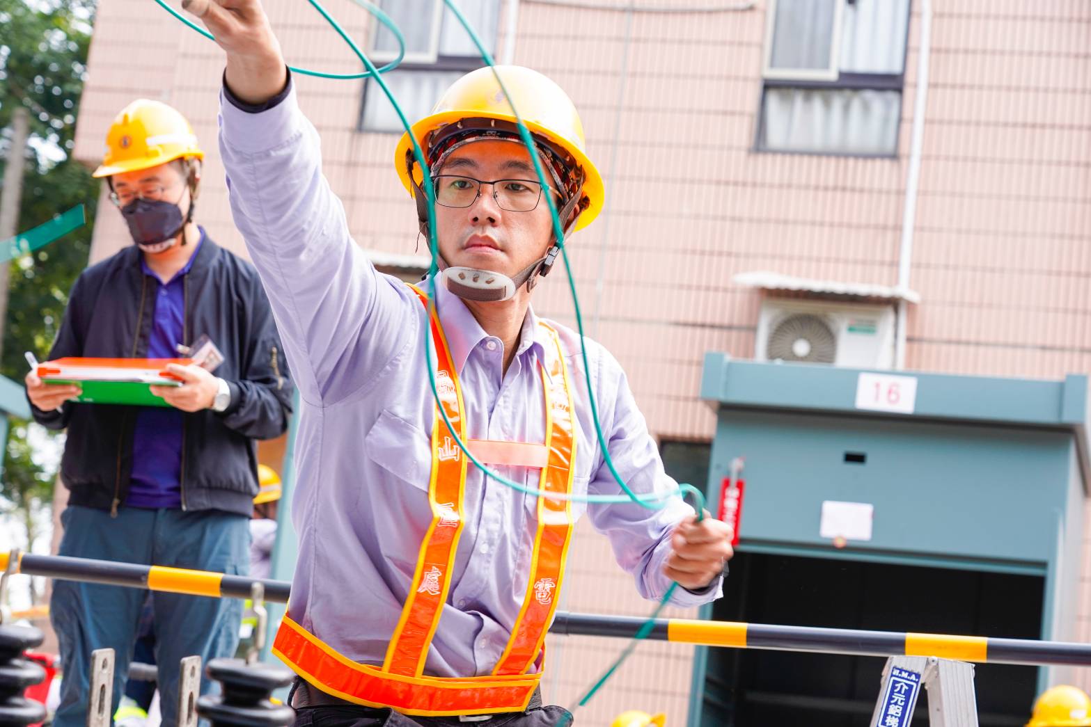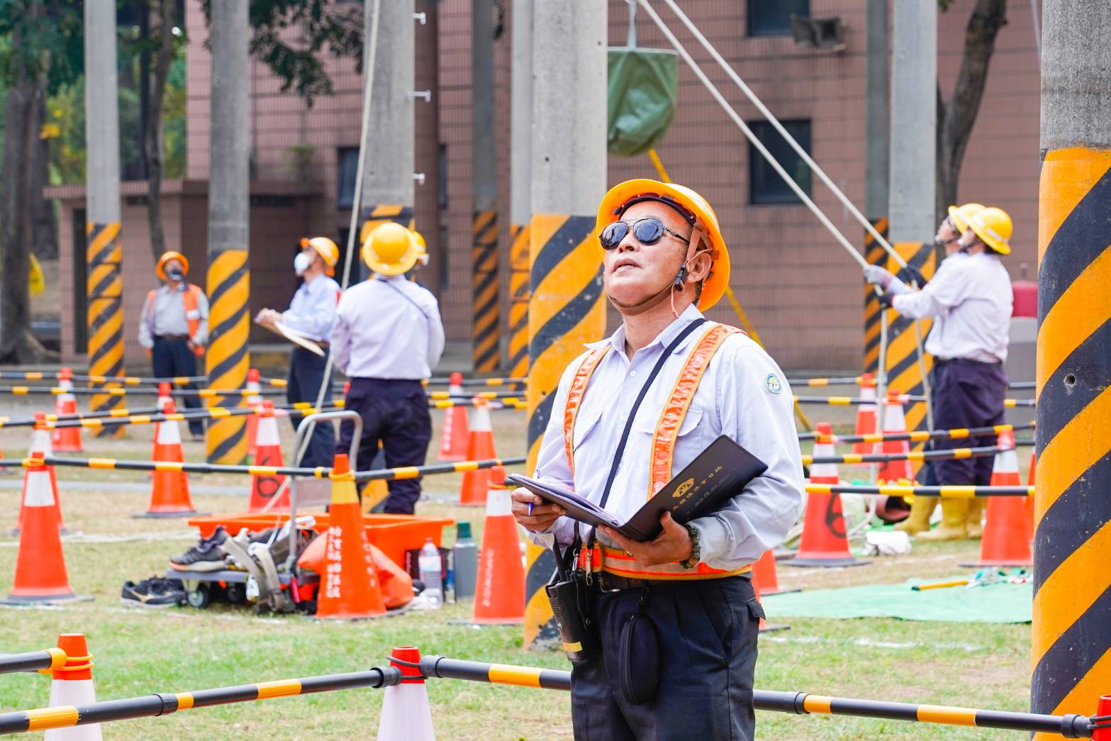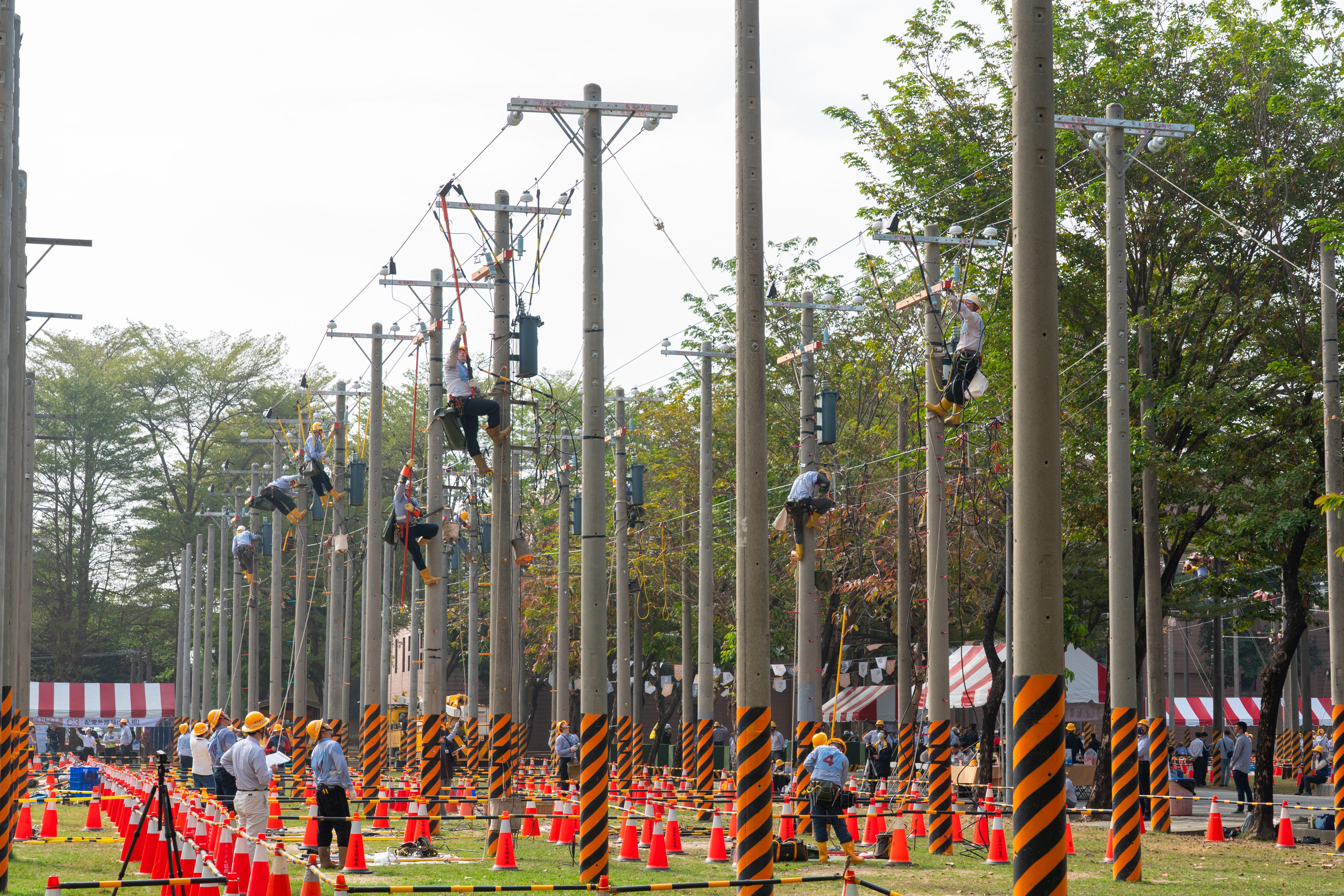 其中,模擬日常停電搶修作業的「配電外線團體組」與「配電事故搶修個人組」項目備受關注,競賽現場模擬搶修作業、更換故障設備,同仁需全副武裝、身著逾10公斤裝備,登上近10公尺高的電線桿較勁搶修技術,共有來自全台各單位近百人爭奪「最強配電搶修王」頭銜。