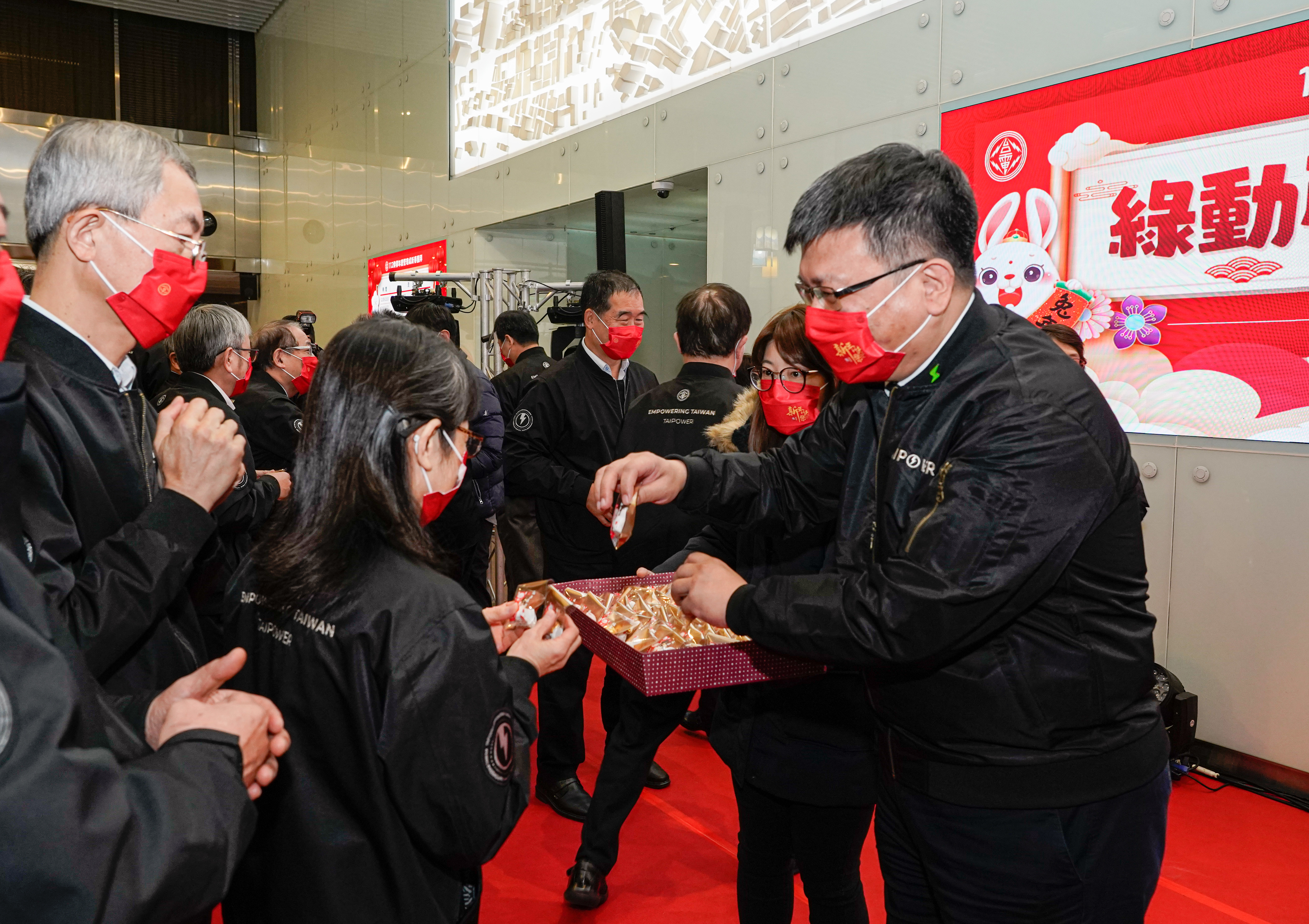 - 台電大家長曾文生、總經理王耀庭帶領各事業部執行長、副總經理、各單位主管與同仁,和工會秘書長蕭鉉鐘等相互拜年,祝賀所有同仁新的一年兔來運轉。