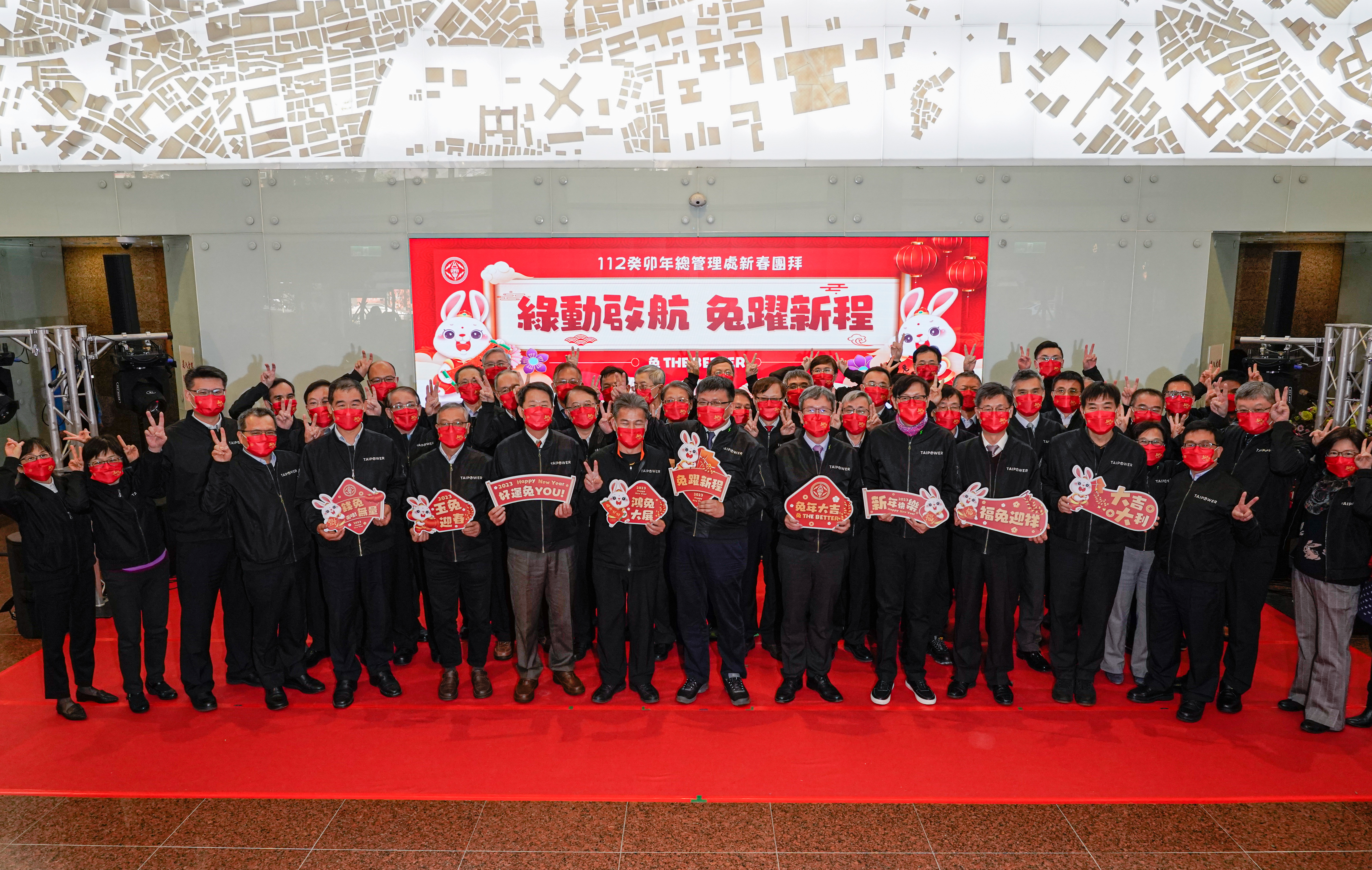 台電今下午於台電大樓舉辦「綠動啟航 兔躍新程」2023年新春團拜活動,會中由台電代理董事長曾文生、總經理王耀庭帶領各事業部執行長、副總經理、各單位主管與同仁,和工會秘書長蕭鉉鐘等上百人齊聚相互拜年,祝賀所有台電同仁新的一年兔來運轉。