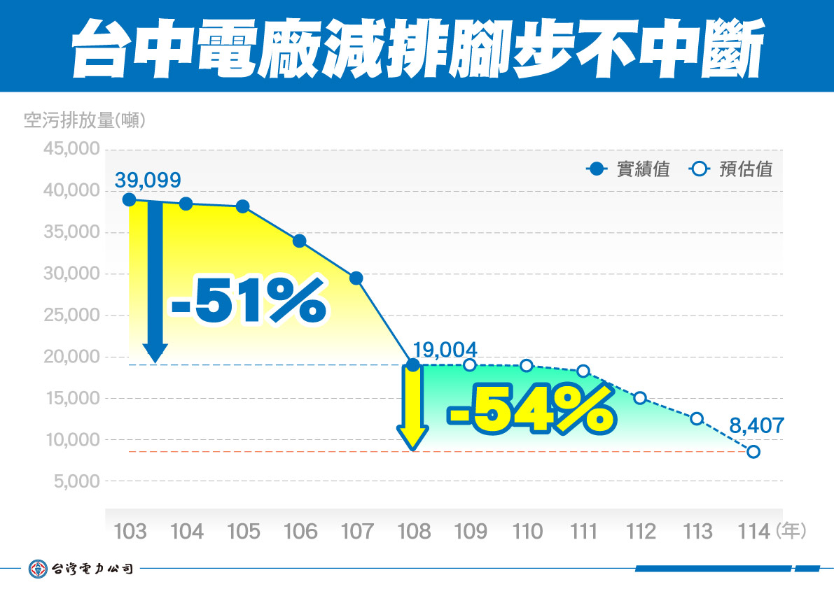 台電進一步指出,中火完成1至4號機空污改善工程,空污排放量已大幅削減,去年中火空污排放量相較於105年排放量已減少5成。中火目前持續規劃針對其他6部機組展開改善工程,預計113年可完成。再加上中火推動新建燃氣機組,預計114年後陸續商轉,屆時以「2氣6煤」的運轉模式,加上先進空污防制設施,預計114年空污排放較去(108)年可再減54%。