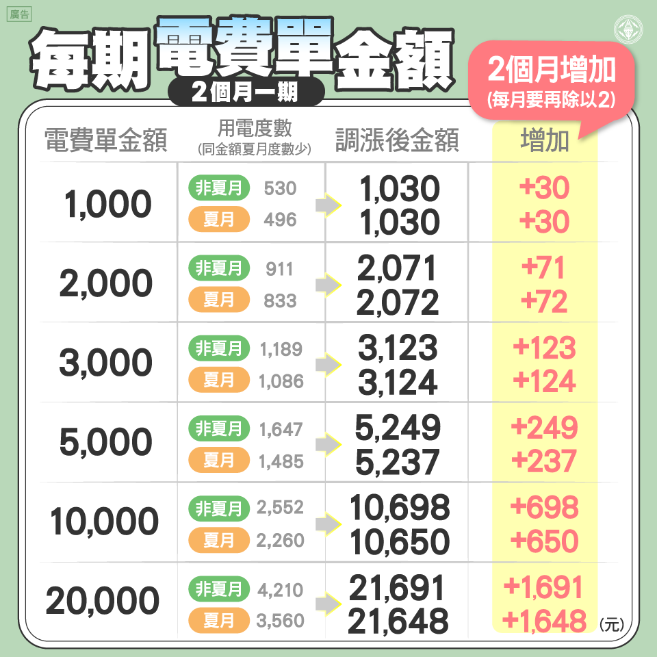 台電也表示,用戶如夏月每期電費帳單約8,000多元,每月約4,000多元,月用電約1,000度,調整後每月增加222元。每月電費如超過4,000元,代表月用電超過1,000度,調整後電費增加會更多,但整體住宅用戶中,僅約2%用戶每月超過1,000度。