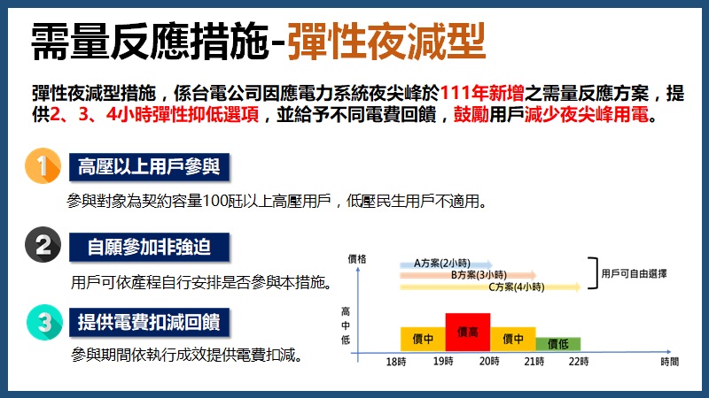 二、 過去需量反應執行以日間為主,為提升夜尖峰供電裕度,進一步擴大夜尖峰抑低成效, 台電公司 於 111年 推出彈性夜減方案, 讓用戶可以在夜晚尖峰時間,自由選擇抑低 2、 3或 4個小時,並依時段差異給予不同電費回饋,讓更多參與需量反應的用戶一同穩定傍晚至夜間的用電負載 ,另 為使用戶儘早熟悉方案內容 、 調整用電習慣, 本方案提前自今年 3月 1日起實施至 10月 31日止,共計 8個月。
