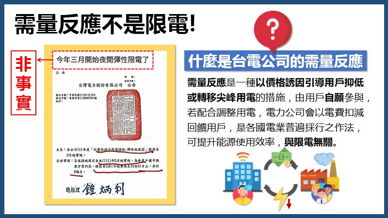 三、 隨著再生能源逐漸併網,用電尖離峰型態改變,台電一方面持續確保穩定供電,同時致力於需求面管理,創造節電誘因重塑用電習慣,期盼與用戶攜手減少電能消耗、縮短電力尖 離峰差距,共同為電網穩定貢獻心力。