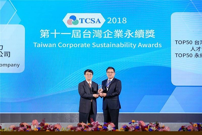 The awards ceremony of '2018 Taiwan Corporate Sustainability Awards' was held at Grand Hotel this morning (20181122). Taipower was bestowed with three awards: 'Corporate Sustainability Report Award—TOP 50 Platinum Award', 'TOP 50 Comprehensive Performance Award' and 'Talented Personnel Development Award'. Chairman Yang Wei-fu represented Taipower to receive the awards from Vice Chairman of Financial Supervisory Commission Zhang Chuanzhang. Taipower won these awards after winning 'Asia Responsible Entrepreneurship Awards' for the first time in June and 'Excellence in Corporate Social Responsibility Award' for the third time in August this year, which showed Taipower's commitment to detailed and complete information disclosure, efforts in managing the company and resolve to achieve environmental sustainability as well as its persistence in promoting corporate social responsibility.